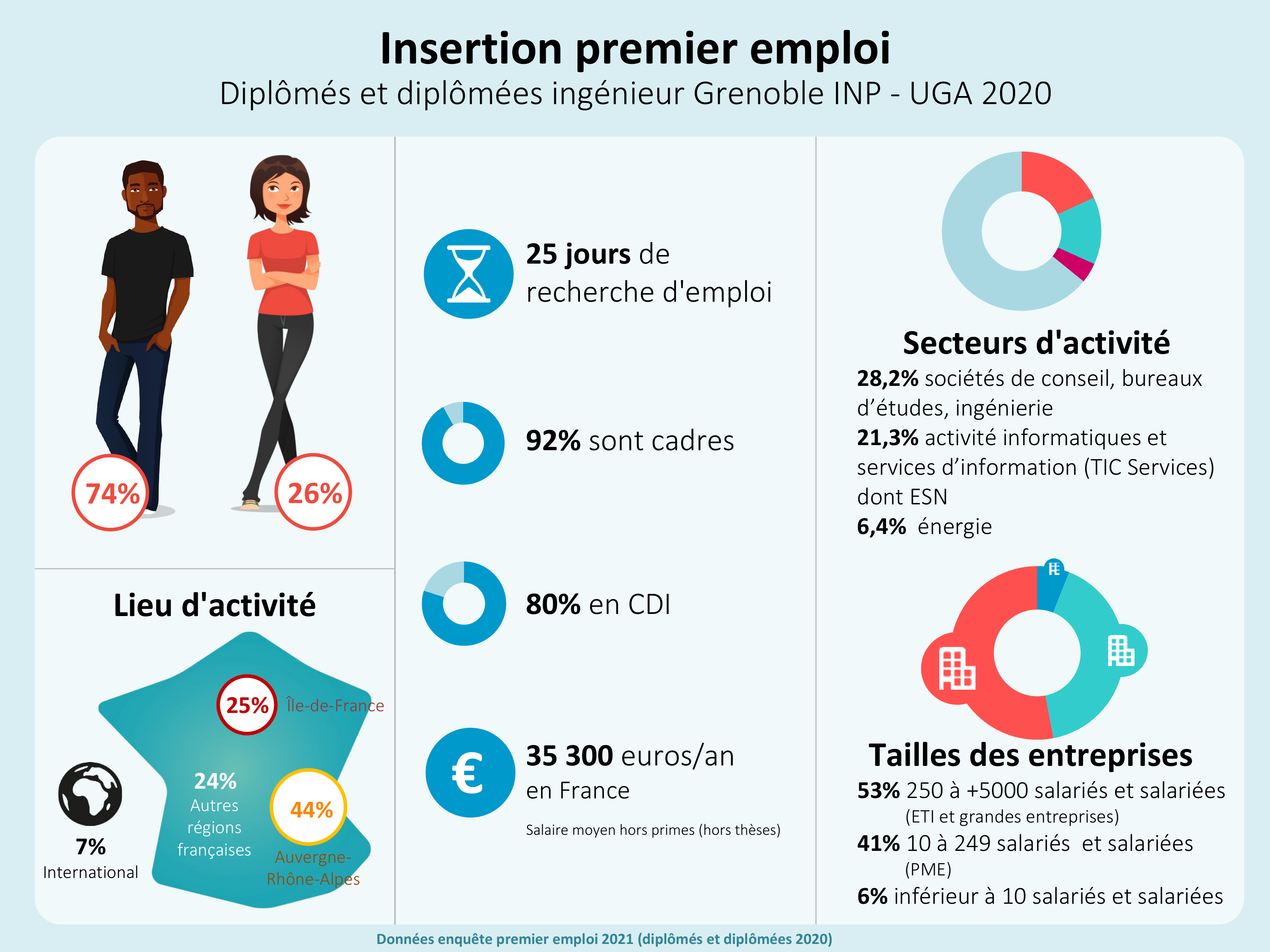*** CGE : conférence des grandes écoles. La CGE conduit une enquête d’insertion professionnelle auprès des 140 écoles d’ingénieurs françaises. Dans le cadre de cette enquête, les jeunes diplômés de Grenoble INP sont interrogés sur leur insertion professionnelle et leur situation 6 mois et 18 mois après l’obtention de leur diplôme d’ingénieur. Le taux de participation à l’enquête est stable entre 2020 (promo 2019) et 2021 (promo 2020). Parmi les diplômés 2020, 26% des participants sont des femmes.