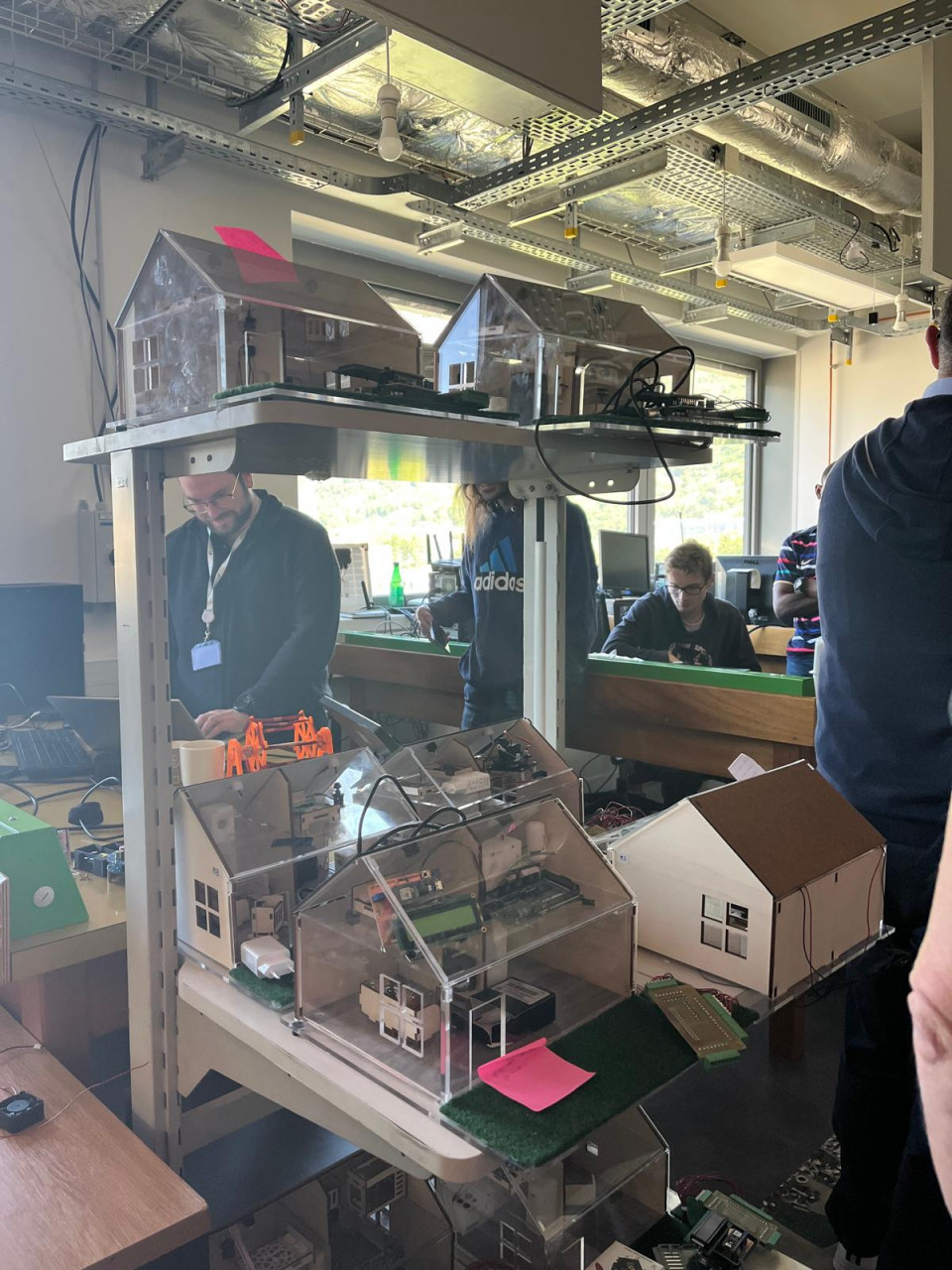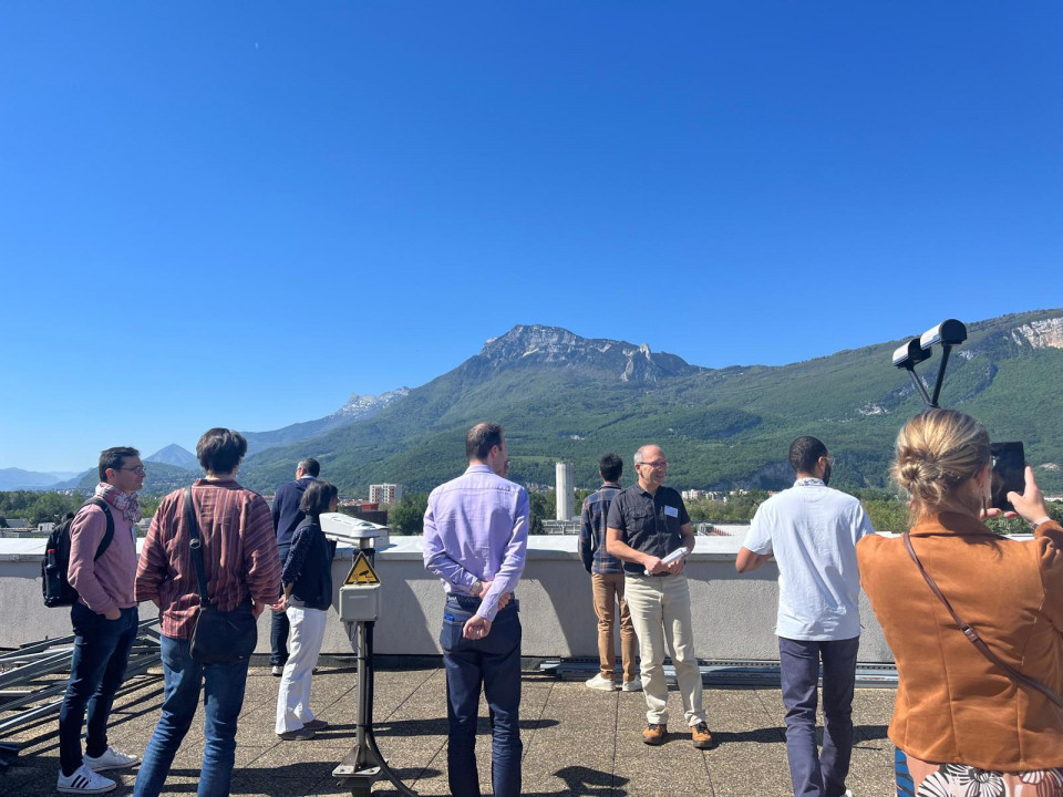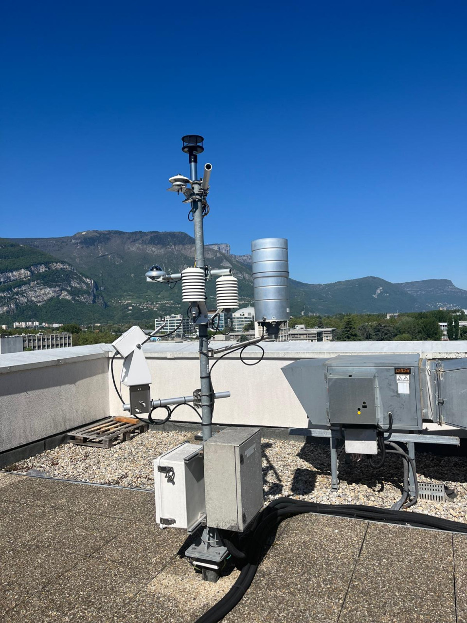 | La visite de l'école a commencé sur le toit, avec la station météo (captation de données pour des laboratoires et certains TP de l’école), qui a la plus belle vue sur la vallée. La station météo est exploitée au G2Elab (Laboratoire de Génie Electrique de Grenoble) dans le cadre de travaux sur la gestion énergétique des bâtiments en lien avec la plateforme Predis-MHI. Rattachée à la plateforme Obs-Eau, elle fournit également des données utilisées par l'IGE (Institut des Géosciences de l'Environnement). Toutes les données produites par la station sont utilisables librement par les élèves et les enseignants de l'école. Présentation des ruches connectées (poids, humidité…) et la serre avec les poissons dans les bassins, pour pouvoir stimulées les plantations | ![]() |