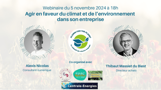 Au programme de ce webinaire, co-organisé par Alumni for the Planet, les groupes Ingénieurs et Développement Durable, Transition et Énergie de Centrale Alumni ainsi qu'ESSEC Transition Alumni :